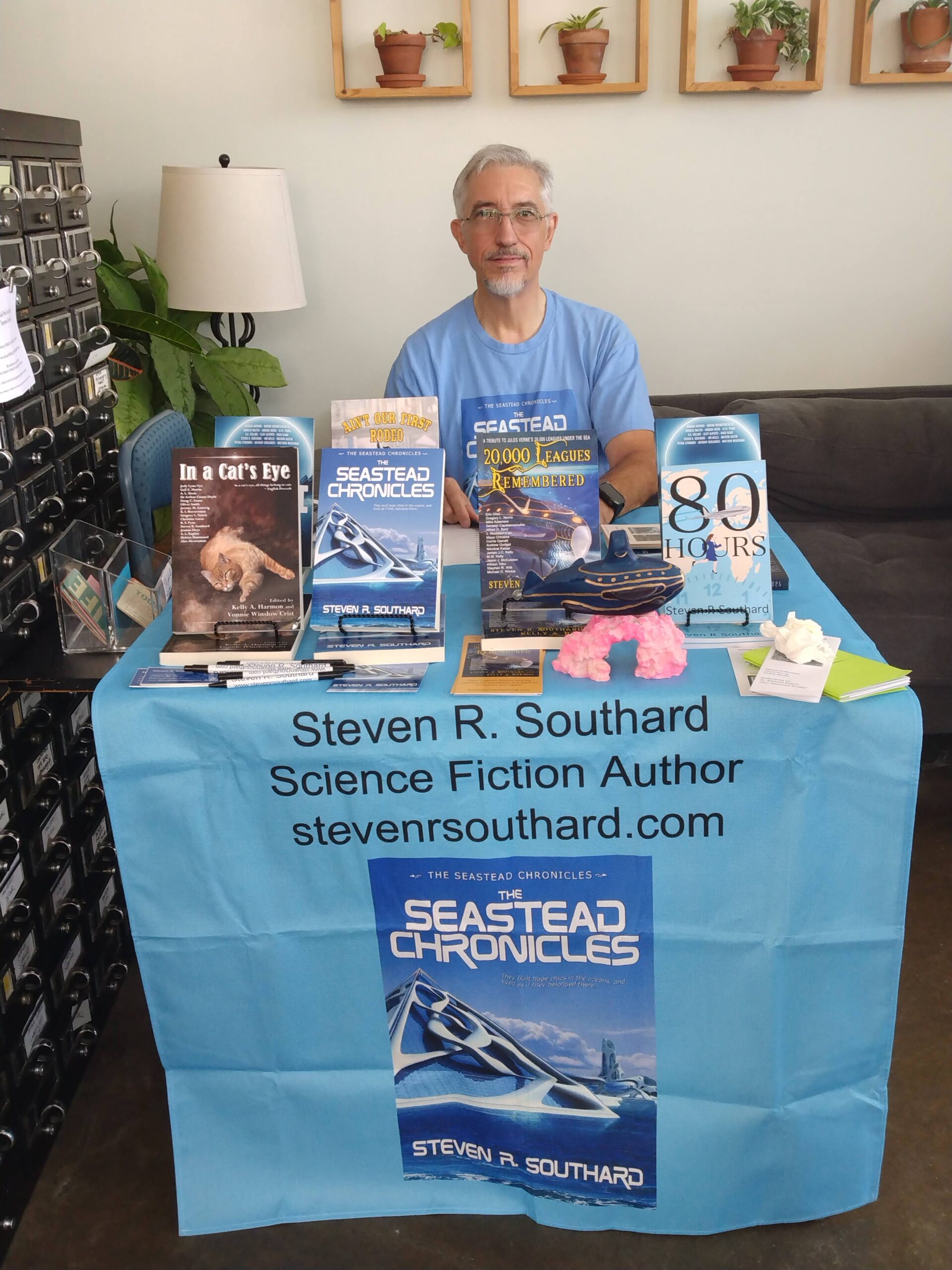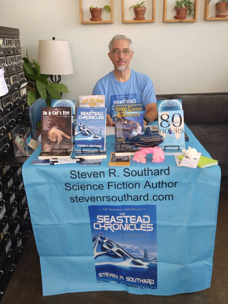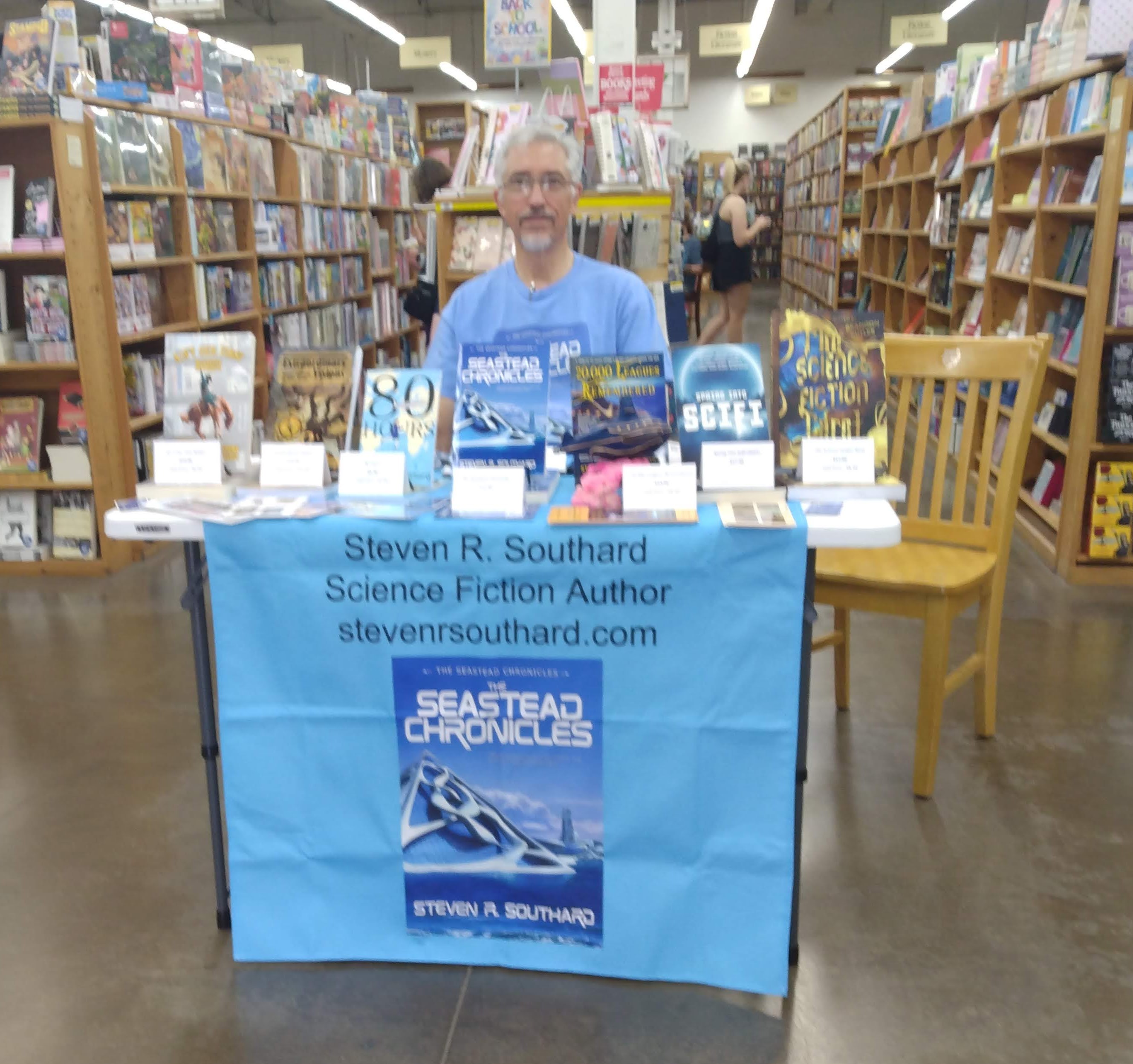 Staff member Jesse set up my table and chair in a commanding position just inside the front door. Incoming customers couldn’t help seeing me there. I focused on my new book, The Seastead Chronicles, but also offered several others, too.