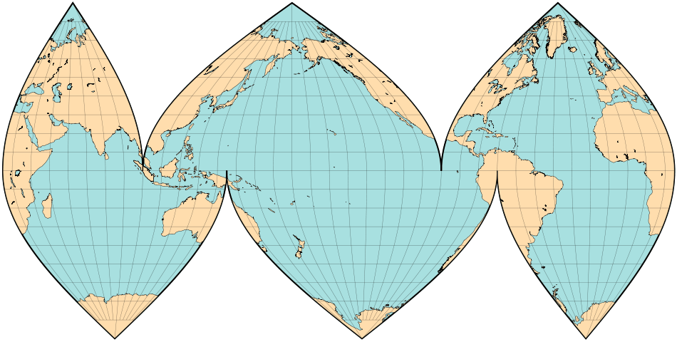 I faced another problem—map projections. Most world maps emphasize land, since that’s where people live…today. However, you can slice the orange other ways, to emphasize the oceans. Therefore, I based my aquastate map on what’s called the Interrupted Goode Homolosine Oceanic View. That map projection carves through land masses so you can focus on the water.