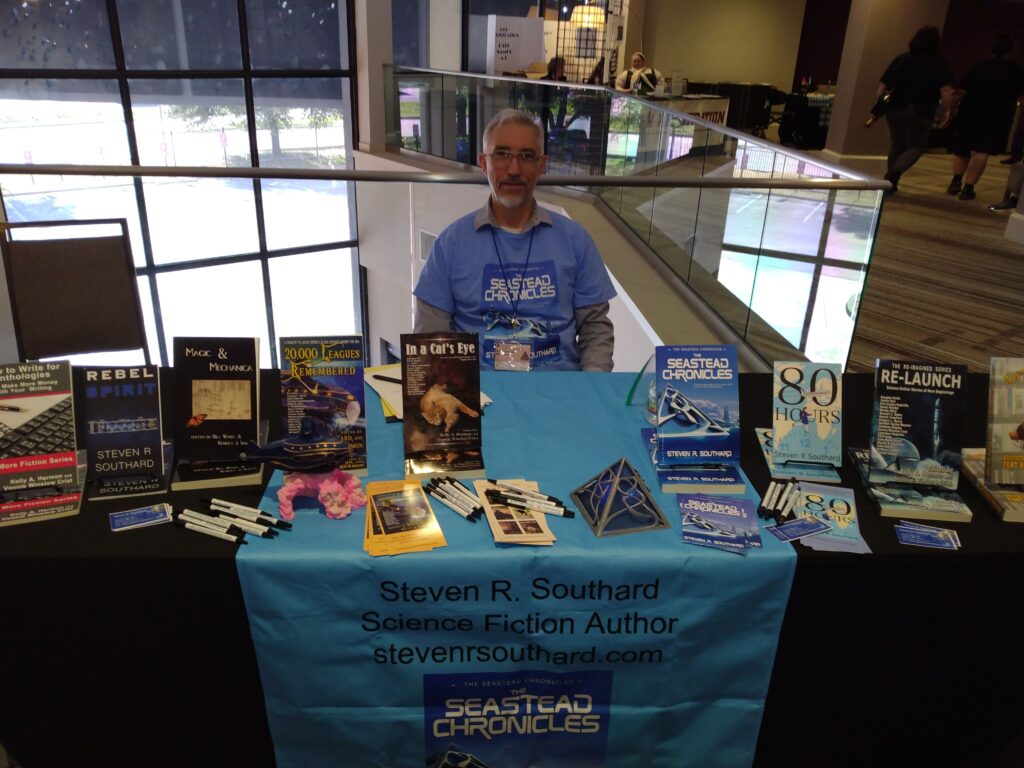 The con organizers granted me a prime location for my table, where I sold several books and conversed with buyers and other passers-by. Fellow author Jan S. Gephardtwhom I’ve interviewed—stopped to talk while on the way to her next panel.